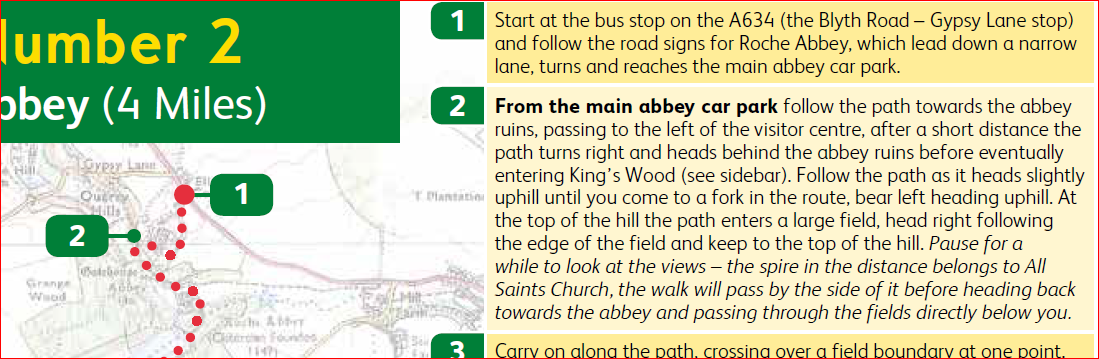 The route on the map starts at a bus stop (1) and then outlines the walk to the Abbey car park (2).