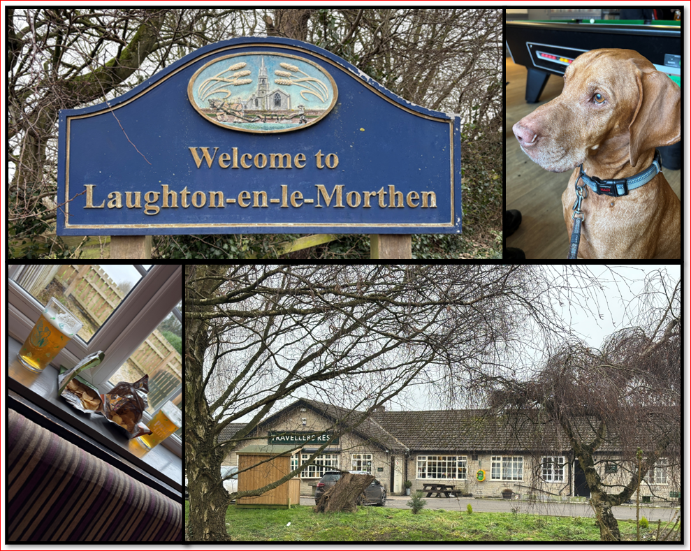 The path along the field was short, and we then crossed a road, heading uphill - there was no footpath for a few metres so be aware. Ahead of us was a rather lovely sign for the Town - it's French name alluding to South Yorkshire's Norman heritage. We then headed left and down Brookhouse Lane. Further down there was is a Public Footpath to the left - just as the road curved and flattens out. This again followed the edge of a field and a building could be seen ahead. This was 'The Traveller's Rest'. We naturally stopped for a pint. The pub building appears to be a 1960's or 1970s structure and so not the appealing 'ye olde worlde' style that we expected. That said, it welcomed dogs and walkers and had a friendly atmosphere. It is part of the Greene King chain, so we enjoyed a pint of 'Priors Rest' and some crisps, before continuing on the final leg of our adventure.